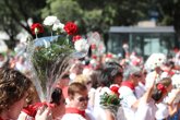 Una multitud de niños y niñas se han congregados este miércoles en el Rincón de la Aduana de Pamplona para honrar a San Fermín en la tradicional ofrenda floral infantil que se celebra en el día de las fiestas dedicado a los más pequeños.