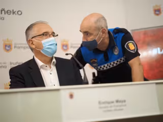 El alcalde de Pamplona, Enrique Maya, con el jefe de Policía Municipal de Pamplona, Javier Goya, este 6 de julio de 2021, día en el que deberían haber comenzado los Sanfermines, suspendidos por la pandemia. - EDUARDO SANZ-EUROPA PRESS
