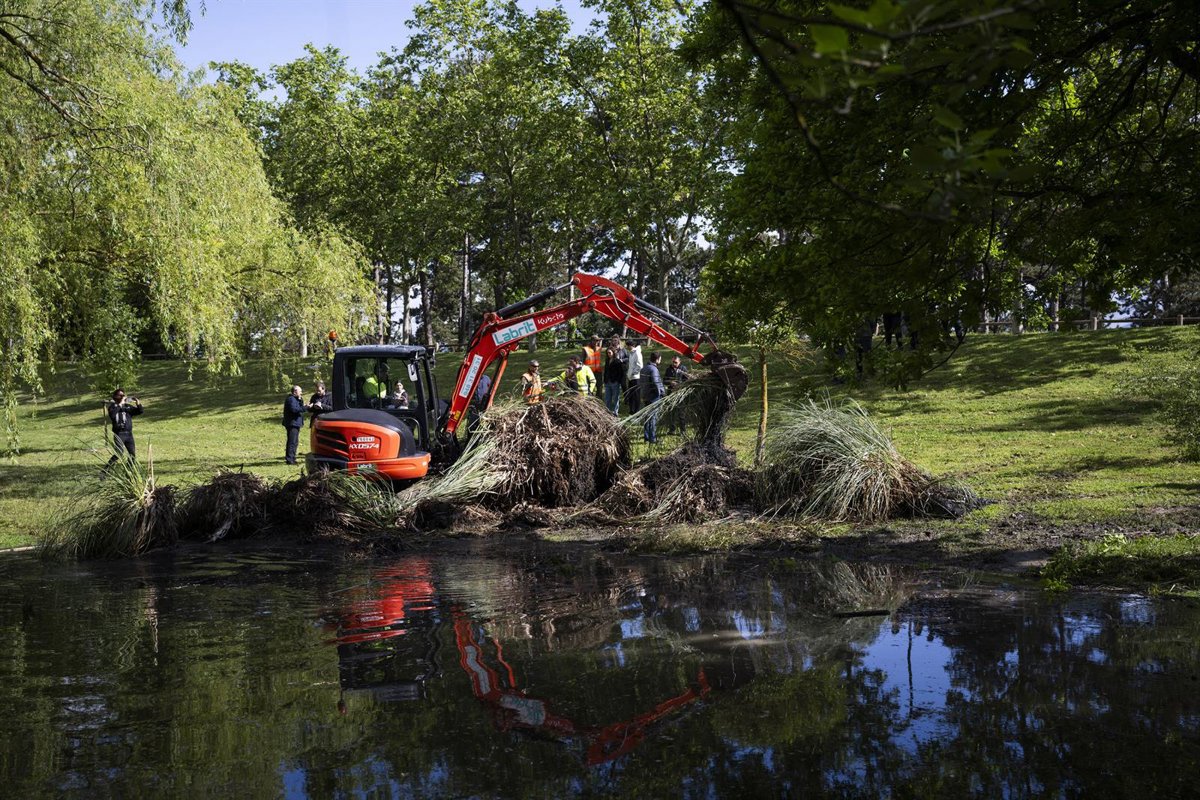 Personal del Ayuntamiento de Zizur Mayor retirando con maquinaria plumero de la Pampa de la balsa de Zizur. - GOBIERNO DE NAVARRA