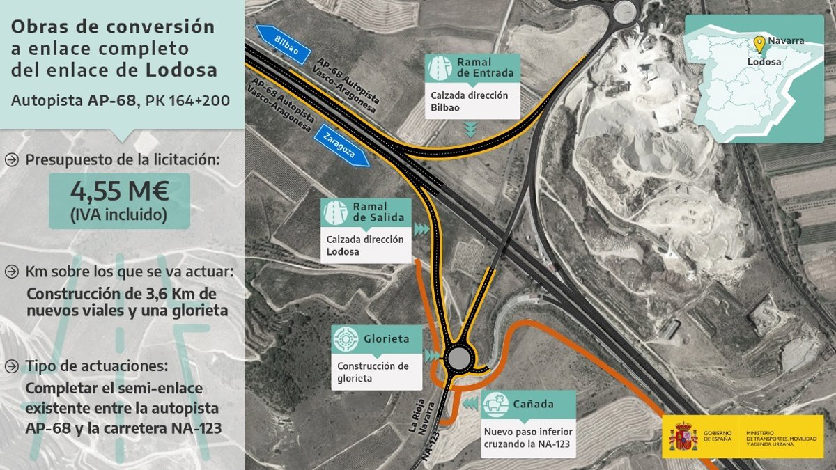 El Ministerio de Transportes, Movilidad y Agenda Urbana (Mitma) ha licitado las obras de remodelación del enlace de Lodosa en el kilómetro 164,200 de la autopista AP-68, ubicadas en los términos municipales de Lodosa (Navarra) y Ausejo (La Rioja), con un presupuesto de 4,55 millones de euros. Próximamente se publicará el correspondiente anuncio en el Boletín Oficial del Estado.