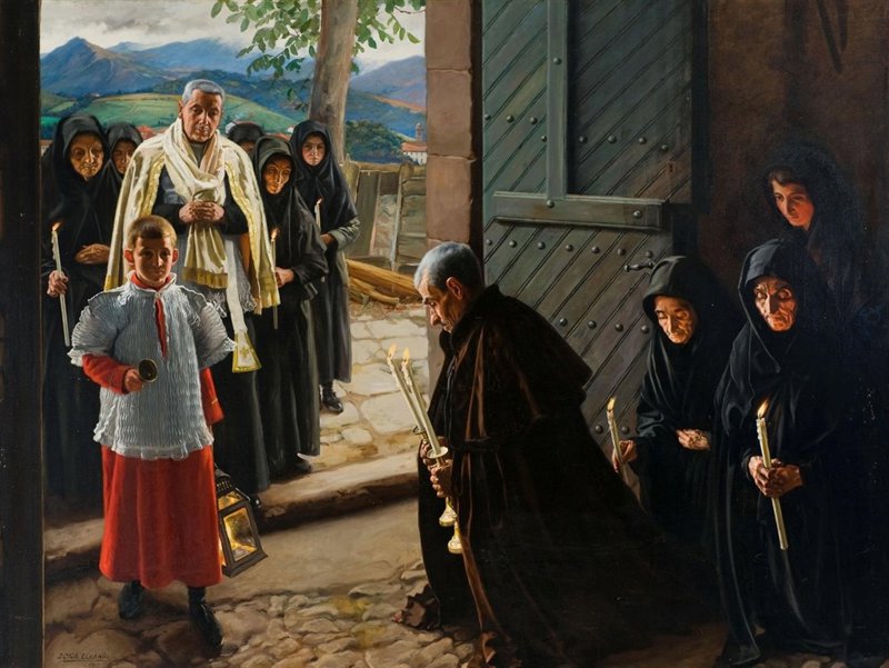 En un primer plano, en la penumbra del zaguán, el palaciano y tres mujeres de diversas edades reciben arrodillados con gran recogimiento a la comitiva. Sus caras se iluminan a la luz de los cirios encendidos que portan en sus manos. También llevan oscuros ropajes. El artista pone su excelente maestría al servicio de la representación de una escena de profundo recogimiento espiritual, protagonizada por habitantes de la montaña de Navarra, inmortalizando una liturgia que hoy se nos hace lejana, ha informado el Gobierno en una nota.