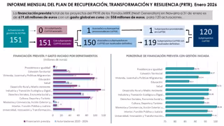 Al término del mes de enero de este 2026 Navarra contaba con un total de financiación de fondos MRR asignada de 619,68 millones de euros. De esta financiación ya se han recibido y contabilizado 610,62 millones y, además, según las cifras recogidas en el sistema contable de la Administración foral, se habían autorizado gastos por un volumen de 558 millones de euros hasta 2026. De ellos, 494,86 ya se encontraban ejecutados al finalizar el mes, lo que supone que el 80% del Plan está ya ejecutado en Navarra.