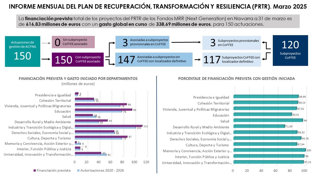 El mes de marzo finalizó con 616,83 millones de euros de financiación de fondos MRR asignados a Navarra. Asimismo, a finales del mes pasado, se habían recibido 614,31 millones de las cuantías derivadas de los fondos del Plan de Recuperación, Transformación y Resiliencia (PRTR) destinadas a la Comunidad Foral.