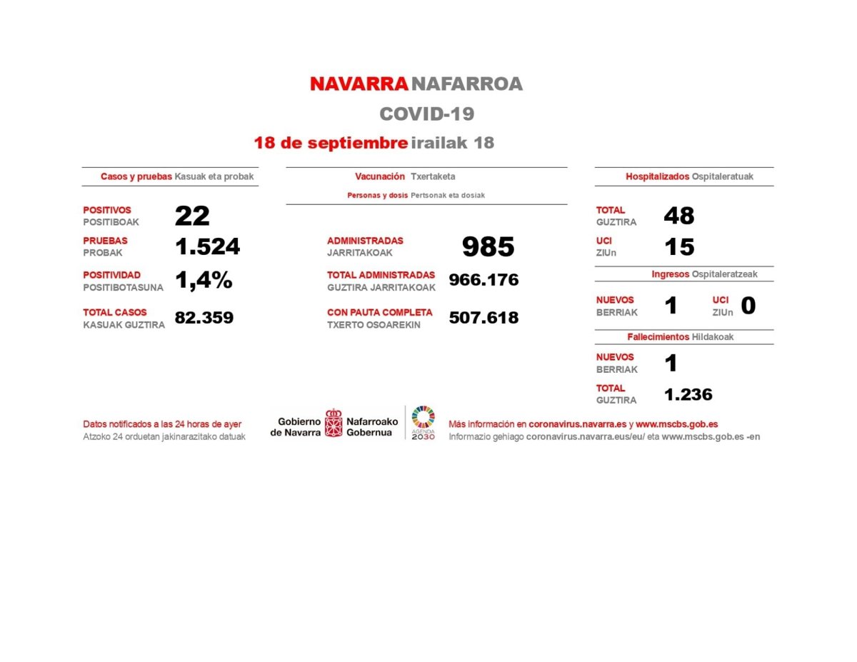 Navarra detectó este viernes 22 casos de Covid-19 tras realizar 1.524 pruebas, lo que deja la tasa de positividad en el 1,4%, según los datos facilitados por el Gobierno foral.