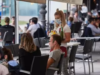 Una trabajadora atiende a los clientes de una terraza en la famosa Plaza del Castillo en las jornadas previas a la entrada en la fase 3 de la desescalada en Pamplona, Navarra, España, a 6 de junio de 2020. - Eduardo Sanz / Europa Press