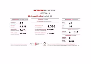 Por otro lado, en el último día se han registrado cuatro ingresos hospitalarios, ninguno de ellos en la UCI. Según la información facilitada por el Gobierno de Navarra, actualmente hay 42 personas ingresadas, diez de ellas en la UCI. No se han registrado fallecimientos en las últimas 24 horas.