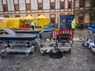 Camillas colocadas en las inmediaciones del Complejo Hospitalario de Navarra donde durante la jornada de hoy diversos voluntarios de la asociación sin ánimo de lucro DYA las han desinfectado para prevenir la expansión del coronavirus. En Pamplona, (Nava - Eduardo Sanz - Europa Press