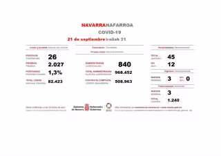 Navarra detectó este lunes 26 casos de Covid-19 tras realizar 2.027 pruebas, lo que deja la tasa de positividad en el 1,3%, según los datos facilitados por el Gobierno foral.