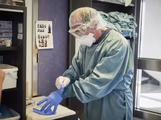 Un trabajador sanitario se coloca un guante en las instalaciones pertenecientes a la UCI de la Clínica Universidad de Navarra, en Pamplona, Navarra, (España) - Eduardo Sanz - Europa Press - Archivo