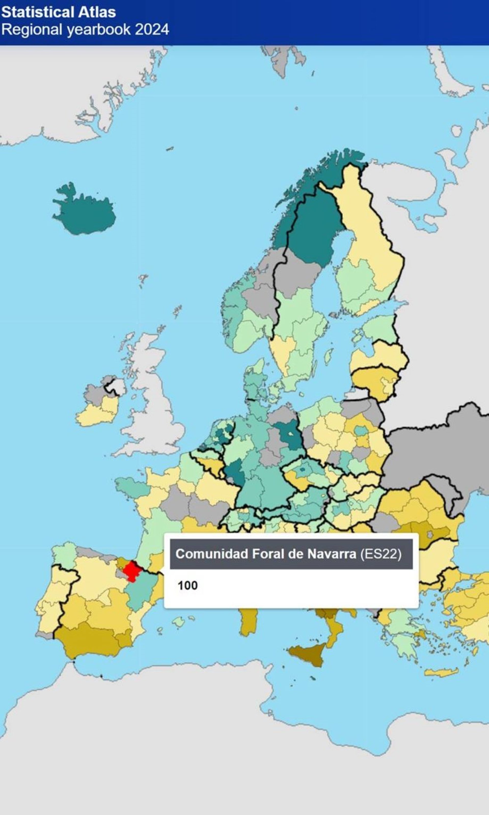 El mapa 5 del estudio publicado ahora por Eurostat, que específica "la privilegiada situación de Navarra", muestra que la tasa de empleo de los graduados profesionales recientes se encontraba en objetivo de política de la UE del 82% (o incluso por encima) en aproximadamente la mitad de las regiones de la UE para las que hay datos disponibles en 2023 (concretamente, en 75 regiones de 153 contempladas). Además, en el extremo superior de la distribución había diez regiones de la UE donde la tasa de empleo de los graduados profesionales recientes era de al menos el 95%. Este grupo incluía la región de la capital checa (Praga), las regiones alemanas de Brandeburgo y Renania-Palatinado, la Comunidad foral en España, Malta, las regiones holandesas de Drente, Flevolanda, Güeldres y Zelanda y vre Norrland en Suecia.