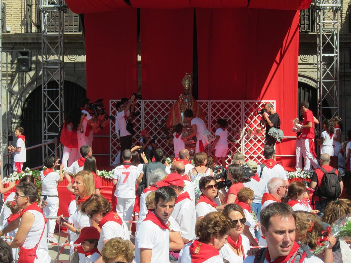 Durante la celebración de este tradicional acto, el grupo Gracia Navarra y Ecos del Arga han dedicado varias jotas a San Fermín, cuya réplica ha sido portada desde el interior de la iglesia hasta el altar instalado en el Rincón de la Aduana ante la expectación de los más pequeños y sus familias, que han recibido al santo entre aplausos.