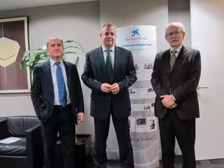 El director de Banca de Particulares de La Caixa en Navarra, Joaquín Arbeloa, y el presidente y gerente de AGAO, Ignacio Moriones y Eduardo Solano, respectivamente, han sido los encargados de presentar este martes en rueda de prensa los detalles de este convenio de colaboración que une a ambas instituciones en el fomento de la cultura.