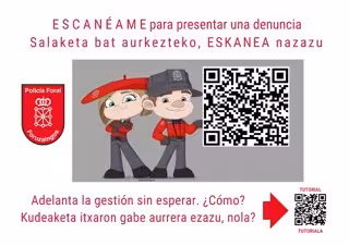 La Policía Foral va a distribuir un cartel con un código QR que, al ser escaneado con el teléfono móvil, permite realizar directamente el trámite de interponer la denuncia. En ese cartel hay otro código QR con acceso a un video tutorial para facilitar las instrucciones del trámite a las personas interesadas en realizarlo.