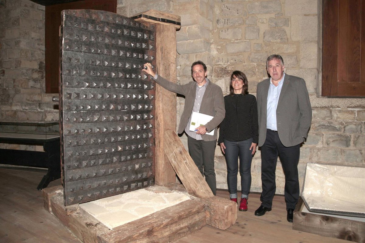 Un panel informativo sobre la exposición recibirá a las personas que visiten la muestra en la planta baja del palacio. Junto a él una réplica a tamaño real de una puerta blindada del castillo que actualmente está colocada en la casa torre Jauregizarrea de Arraiotz.