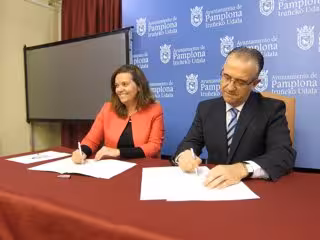 El alcalde de Pamplona, Enrique Maya, y la directora territorial de La Caixa en Navarra, Ana Díez, han firmado este martes un convenio de colaboración para financiar gafas a al menos 150 menores.