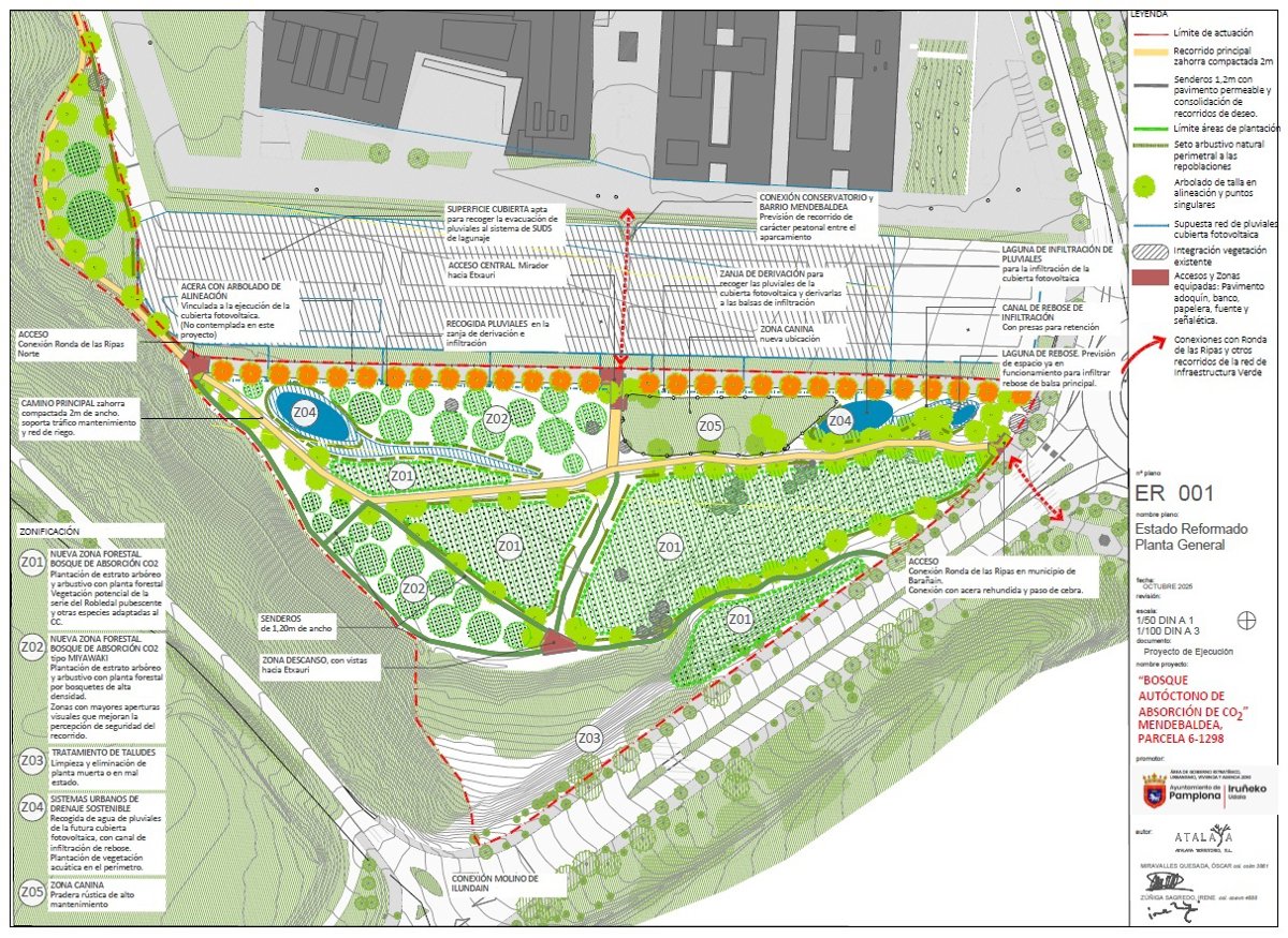 La actuación está definida por el 'Proyecto de bosque urbano autóctono de absorción de CO2 en Mendebaldea, Parcela 6-1298 de Pamplona', elaborado por la empresa Atalaya Territorio SL y promovido por el área de Gobierno Estratégico, Urbanismo, Vivienda y Agenda 2030 del Ayuntamiento de Pamplona.