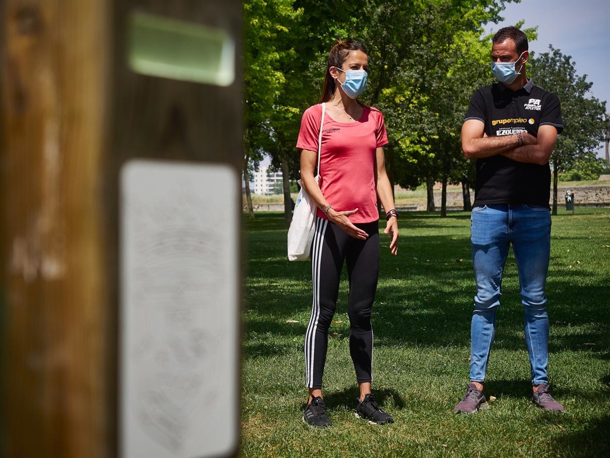 El presidente de la Federación Navarra de Atletismo, Rodrigo Domínguez, y la atleta Maitane Melero durante la inauguración de un circuito de running de la Vuelta del Castillo, en Pamplona, Navarra, (España), a 2 de junio de 2020. - Eduardo Sanz - Europa Press