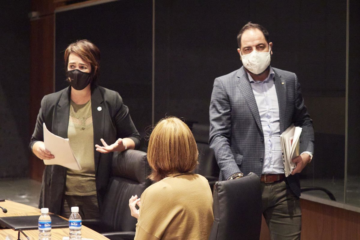 La portavoz de Geroa Bai, Uxue Barkos (c); y la parlamentaria de Podemos Ainhoa Aznárez (i), hablan junto al portavoz del PSN, Ramón Alzórriz, a su llegada a la Mesa y Junta de portavoces en el Parlamento de Navarra, en Pamplona, en una imagen de archiv - Eduardo Sanz - Europa Press - Archivo
