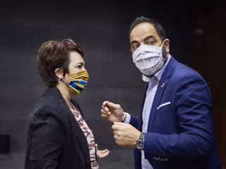 La parlamentaria de Podemos Ainhoa Aznárez habla con el portavoz del PSN, Ramón Alzórriz. - Eduardo Sanz - Europa Press - Archivo