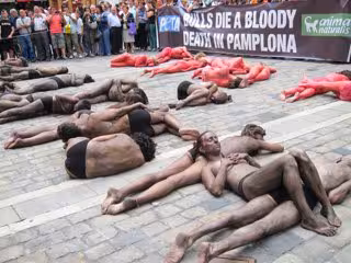 Una treintena de integrantes de los colectivos Peta y AnimaNaturalis han protestado un año más en Pamplona contra "el martirio y el calvario" que a su juicio sufren los toros en los encierros de San Fermín y en las corridas de toros.