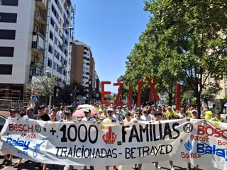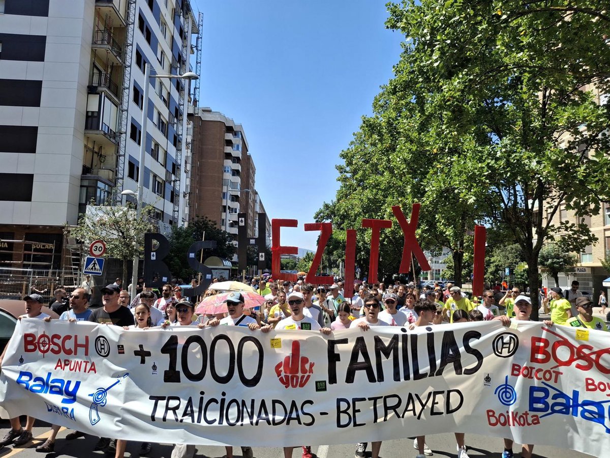 La manifestación ha partido, pasadas las 12.15 horas, desde la plaza de Europa. Abrían la marcha trabajadores de la empresa que portaban un ataúd con la inscripción 'Tu amigo de Balay'. Le seguía una pancarta con el lema '+1000 familias traicionadas' y un llamamiento al boicot de Bosch y Balay. Varios de los manifestantes llevaban camisetas con el mensaje '1.000 familias sin futuro' y se han coreado consignas como 'Ya no hay amigos en Balay' o 'BSH no se cierra'.