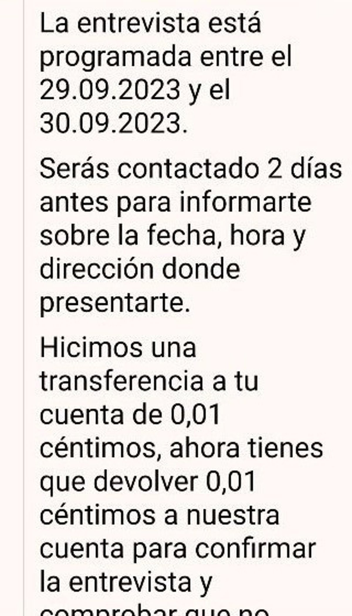 Las personas que han solicitado participar en el proceso de selección de la oferta han recibido un correo electrónico en el que, simulando tratarse de una empresa real, informan a los solicitantes del empleo de que les han hecho una transferencia de 0,01 céntimos, cuantía que deben abonar de retorno al mismo número de cuenta de la empresa, para confirmar de esta manera la asistencia a la entrevista, explica el cuerpo policial.