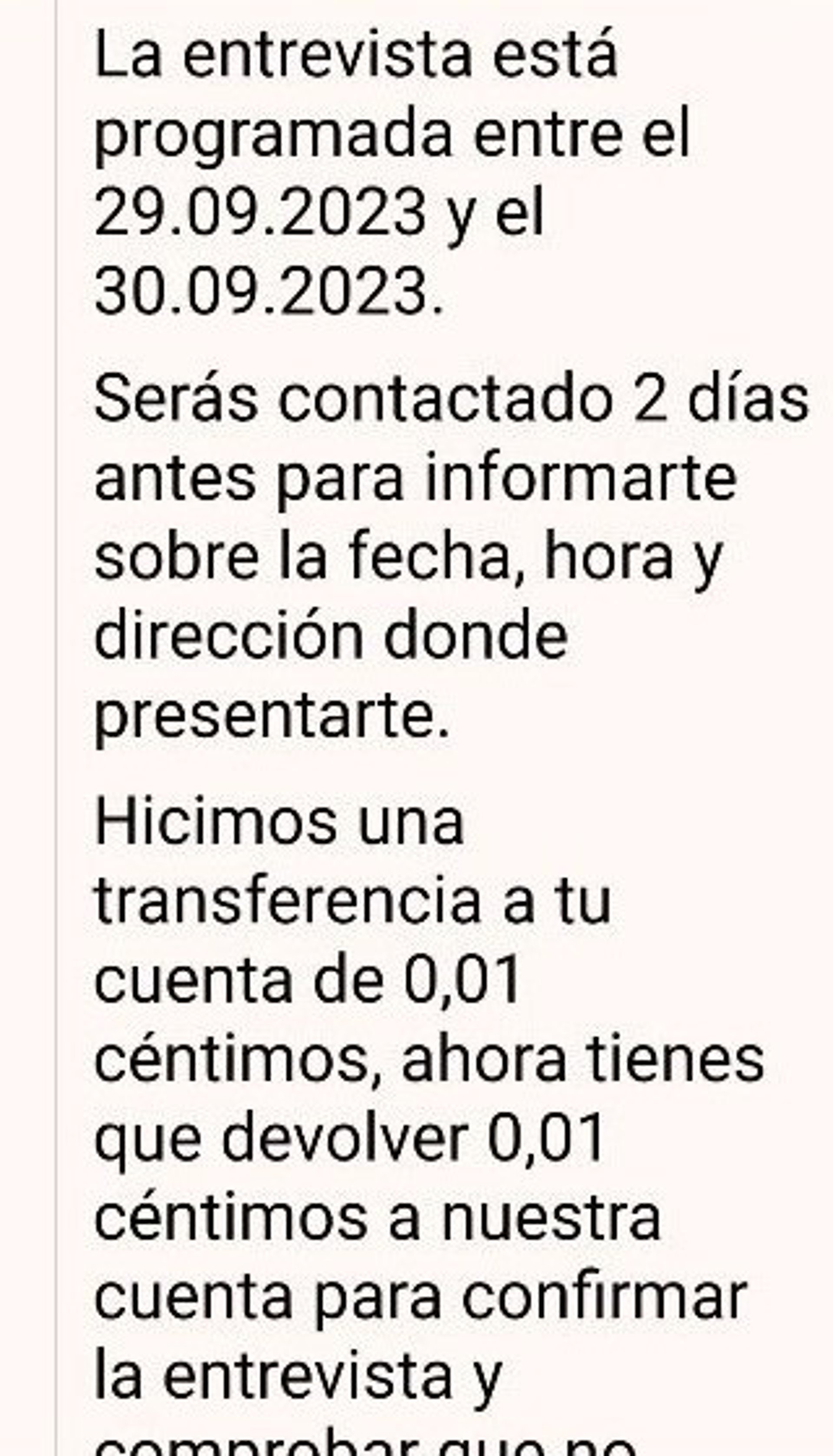 Por ello, se advierte que si ha solicitado participar en un proceso selectivo y le solicitan que realice una transferencia, aunque sea, como en este caso, de muy poco dinero, no la realice.