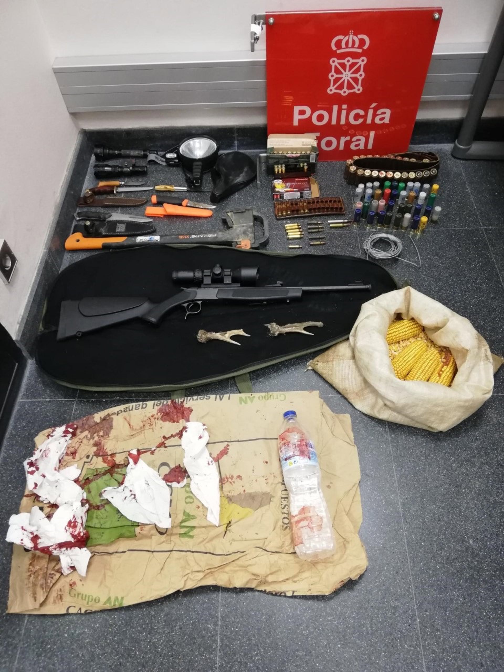 En el registro del vehículo, se localizaron diversos útiles y ropajes de caza, un rifle con visor de aumento y dos machetes utilizados para caza mayor, un centenar de cartuchos y balas de distinto calibre repartidos por todo el habitáculo, un cuchillo, dos navajas, un hacha, dos linternas, una de ellas de luz verde para uso exclusivo en caza nocturna y preparada para acoplarla al rifle, un foco, un frontal, dos rollos de sirga, cuatro precintos para corzo, cinchas, un saco de maíz en mazorcas y en grano y dos cuernos de corzo.