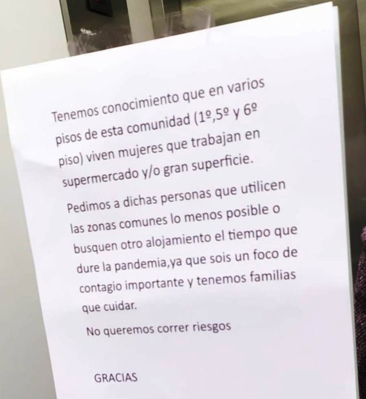 El mensaje dice así: "Tenemos conocimiento de que en varios pisos de esta comunidad (1, 5 y 6 piso) viven mujeres que trabajan en supermercado y/o gran superficie. Pedimos a dichas personas que utilicen las zonas comunes lo menos posible o busquen alojamiento el tiempo que dure la pandemia, ya que sois un foco de contagio importante y tenemos familias que cuidar. No queremos correr riesgos. Gracias".