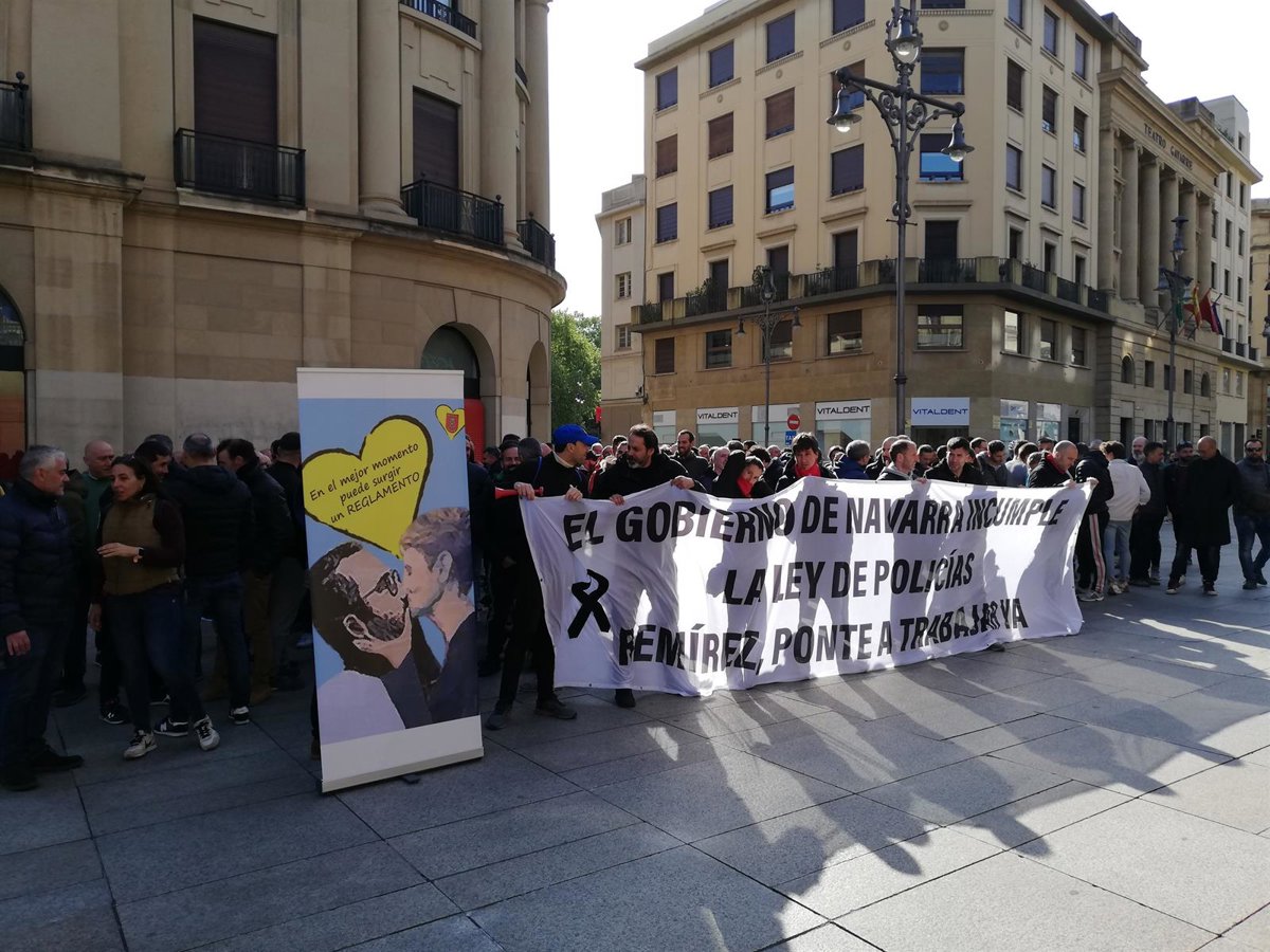 Alrededor de 200 agentes se han concentrado a las 9.30 horas frente al Palacio de Navarra, donde han desplegado una pancarta con el mensaje 'El Gobierno de Navarra incumple la ley de Policías. Remírez ponte a trabajar'. También han colocado un cartel, con un dibujo de María Chivite y Javier Remírez besándose, con el mensaje 'En el mejor momento puede surgir un reglamento'. Los asistentes, algunos de los cuales llevaban puesto el tradicional pañuelico rojo de las fiestas de San Fermín, han hecho sonar bocinas y silbatos, han gritado 'Sin reglamento no hay San Fermín' y han cantado el 'Pobre de mí'.