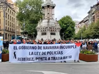 Más de un centenar de miembros de la Policía Foral se han concentrado junto al Monumento a los Fueros, en Pamplona, tras una pancarta en la que se podía leer 'El Gobierno de Navarra incumple la ley de Policías. Remírez, ponte a trabajar ya".