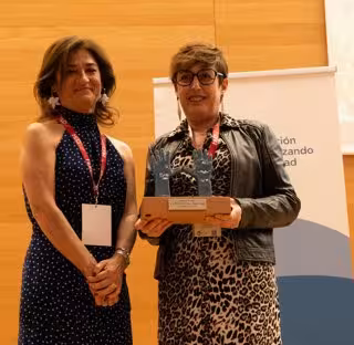 Geno Ochando (dcha.), presidenta del OMD, recoge el premio de manos de Inmaculada Romero Sánchez, secretaria general del Sindicato Médico de Córdoba. - UPNA