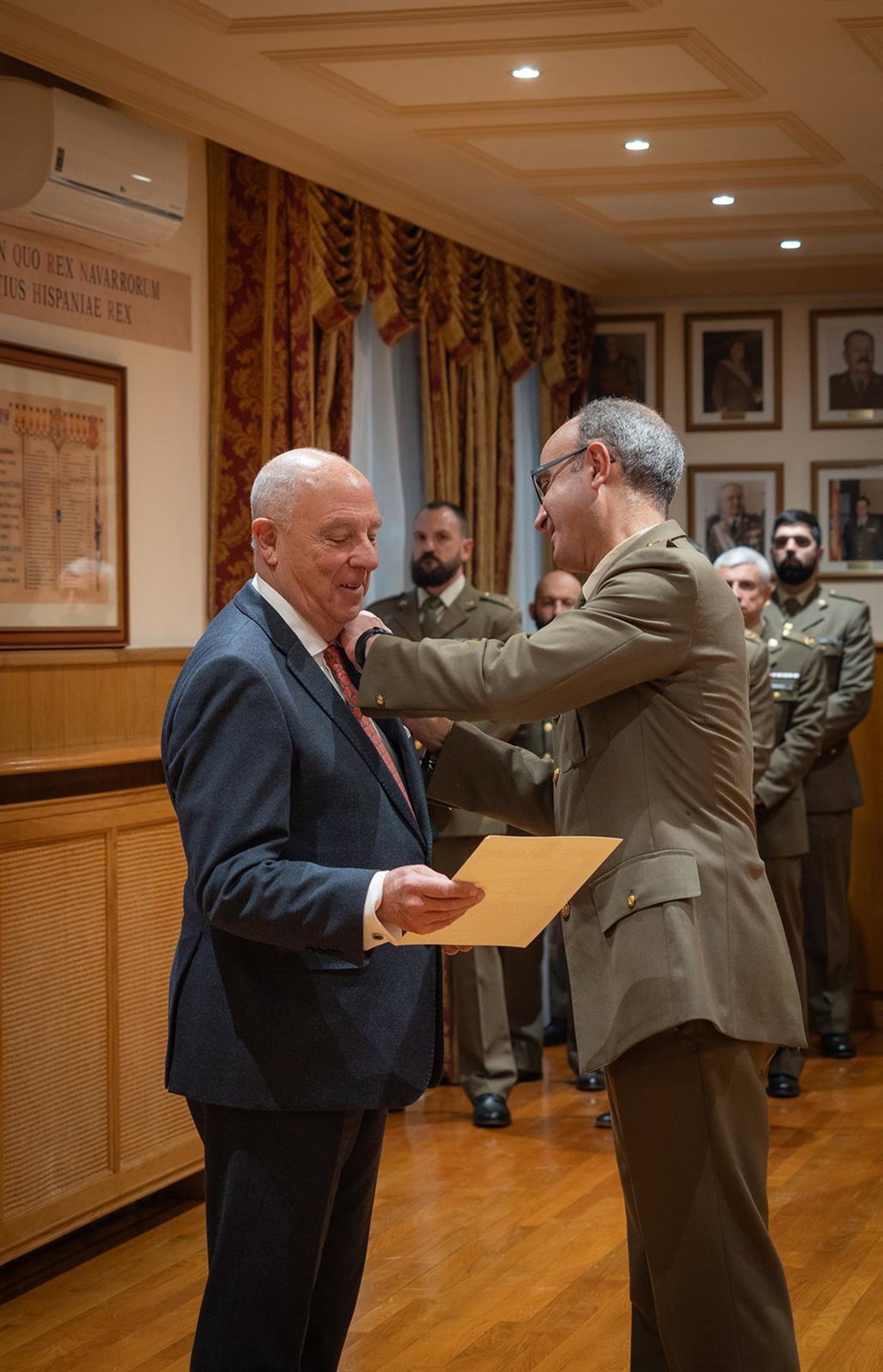 El presidente de la Cámara de Comercio de Navarra, Javier Taberna, y el director de Radio Rioja-Cadena Ser, Alberto Aparicio Barba, han recibido este martes de manos del comandante general de Navarra, Francisco Germán Martínez Lozano, la Cédula de Embajador Marca Ejército, un reconocimiento otorgado a destacadas personalidades que han contribuido a la difusión de los valores y la imagen institucional del Ejército de Tierra.