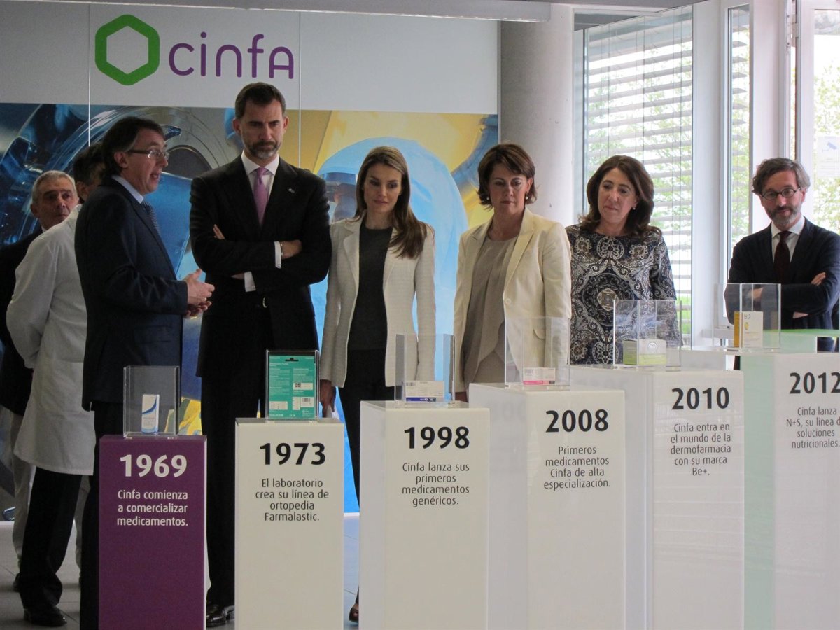 Tras saludar a los responsables y representantes de la empresa, Don Felipe y Doña Letizia han accedido a las instalaciones y han conocido el trabajo que desarrolla la compañía farmacéutica de la mano del presidente de la empresa, Enrique Ordieres, quien les ha explicado la evolución de Cinfa, empresa creada en 1969 de capital cien por cien nacional que "reinvierte cada año el 90 por ciento de sus beneficios en la empresa".