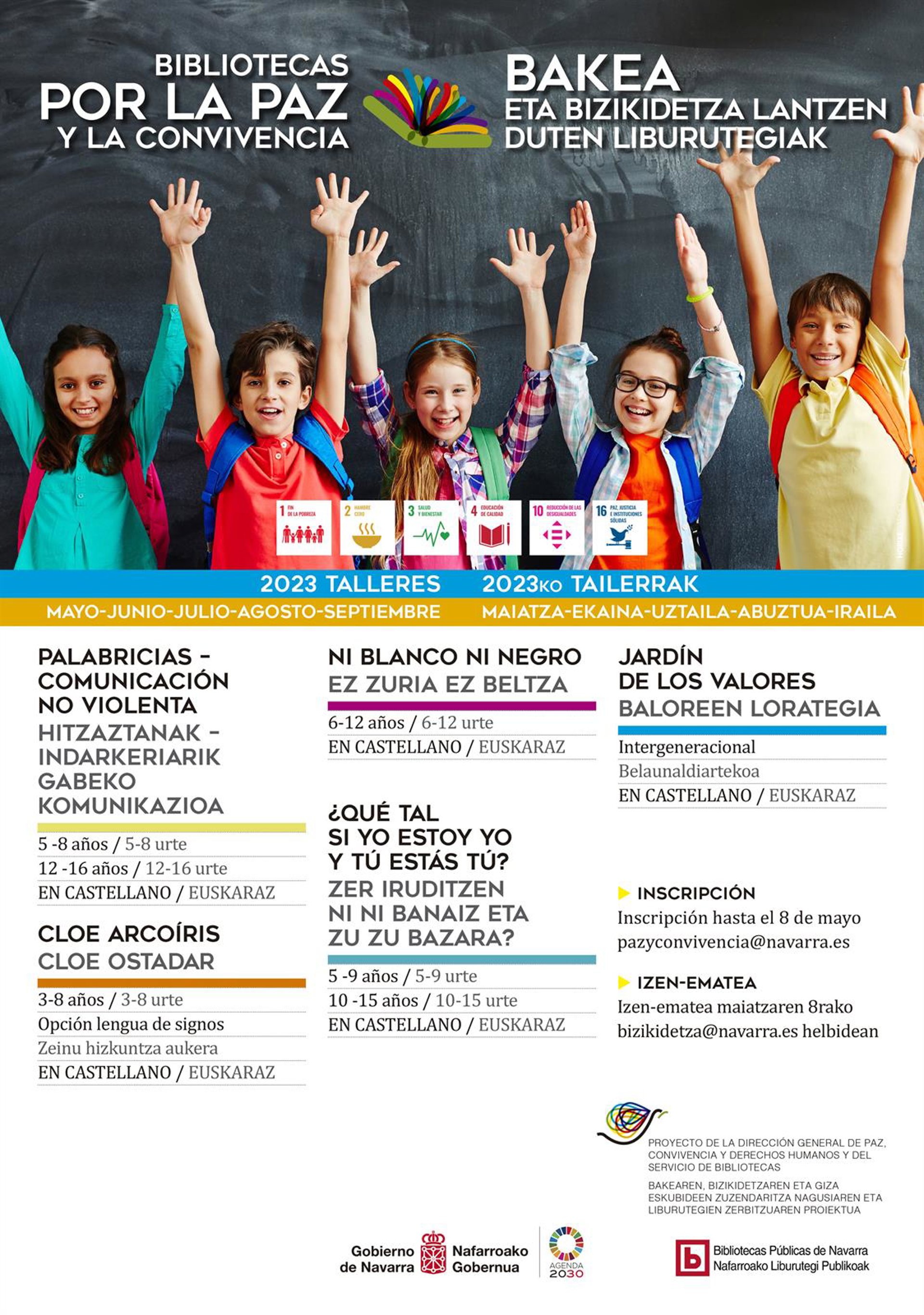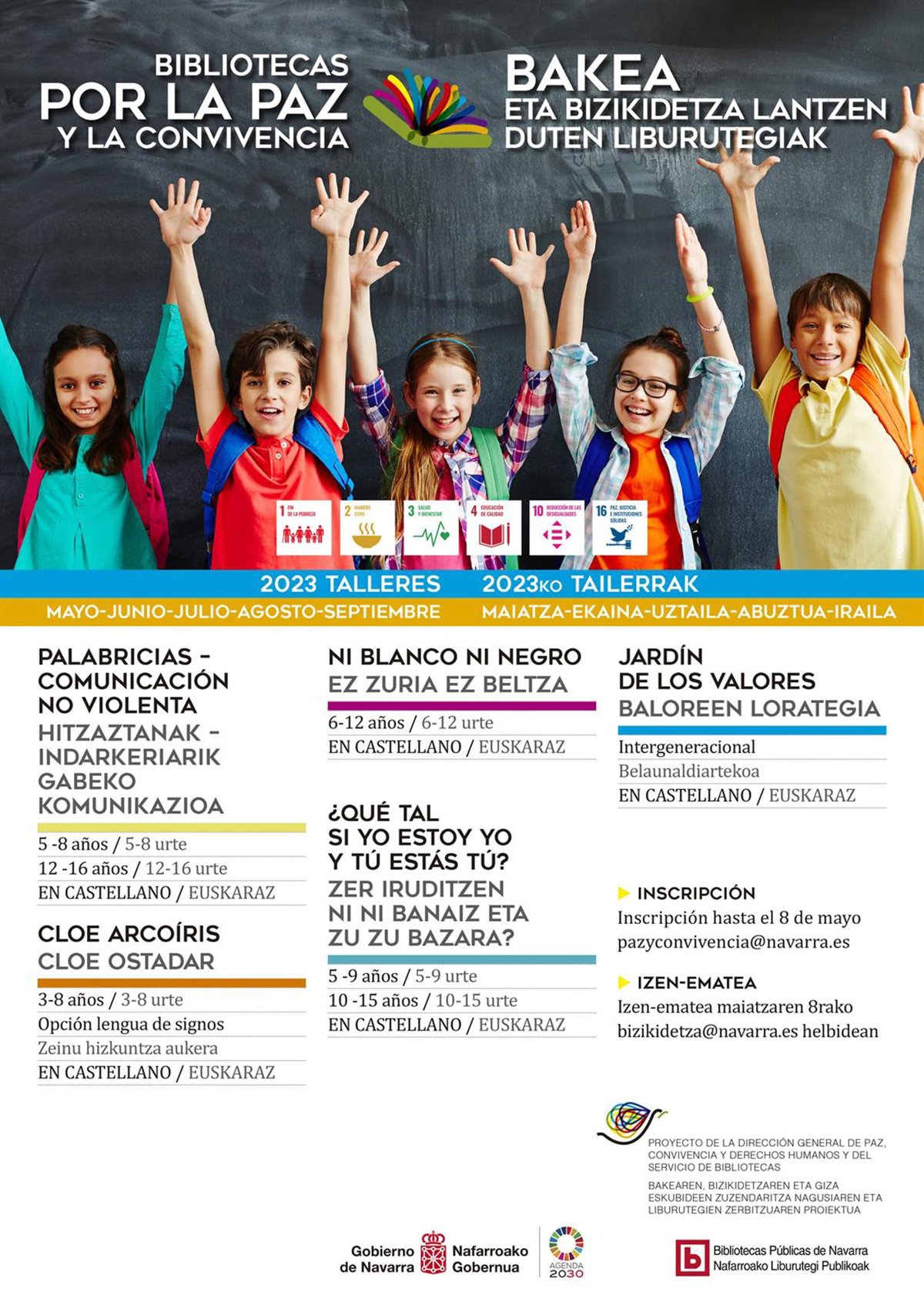 El Gobierno de Navarra, a través del programa 'Bibliotecas por la Paz y la Convivencia', en el que cooperan el Servicio de Bibliotecas del Departamento de Cultura y Deporte, y el Servicio de Convivencia y Derechos Humanos del Departamento de Relaciones Ciudadanas, ha puesto por cuarto año consecutivo a disposición de las bibliotecas públicas de Navarra seis talleres presenciales para niños, niñas, adolescentes y personas adultas que se llevarán a cabo tanto en euskera como en castellano.