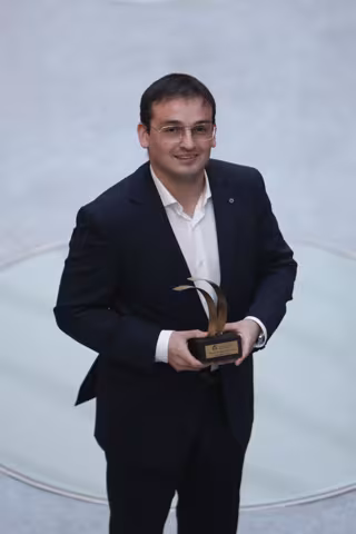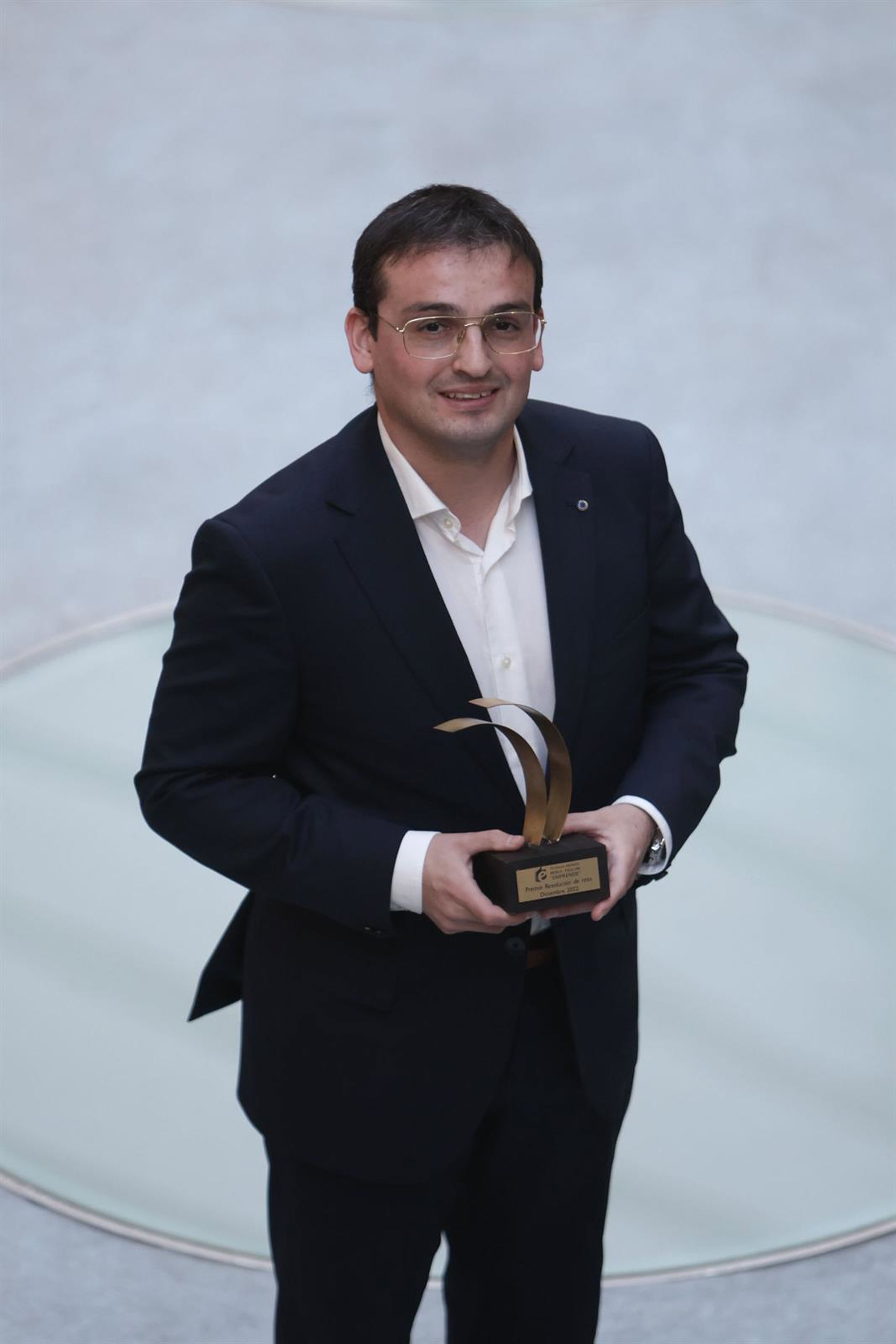Asier Martínez, en nombre de Quimsil (UPNA), con el premio por la mejor resolución de los retos innovadores - UPNA