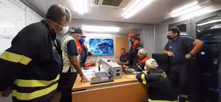 Responsables del Servicio de Bomberos estudiando la evolución del incendio de Lónguida en la pantalla del puesto de mando avanzado. - GOBIERNO DE NAVARRA