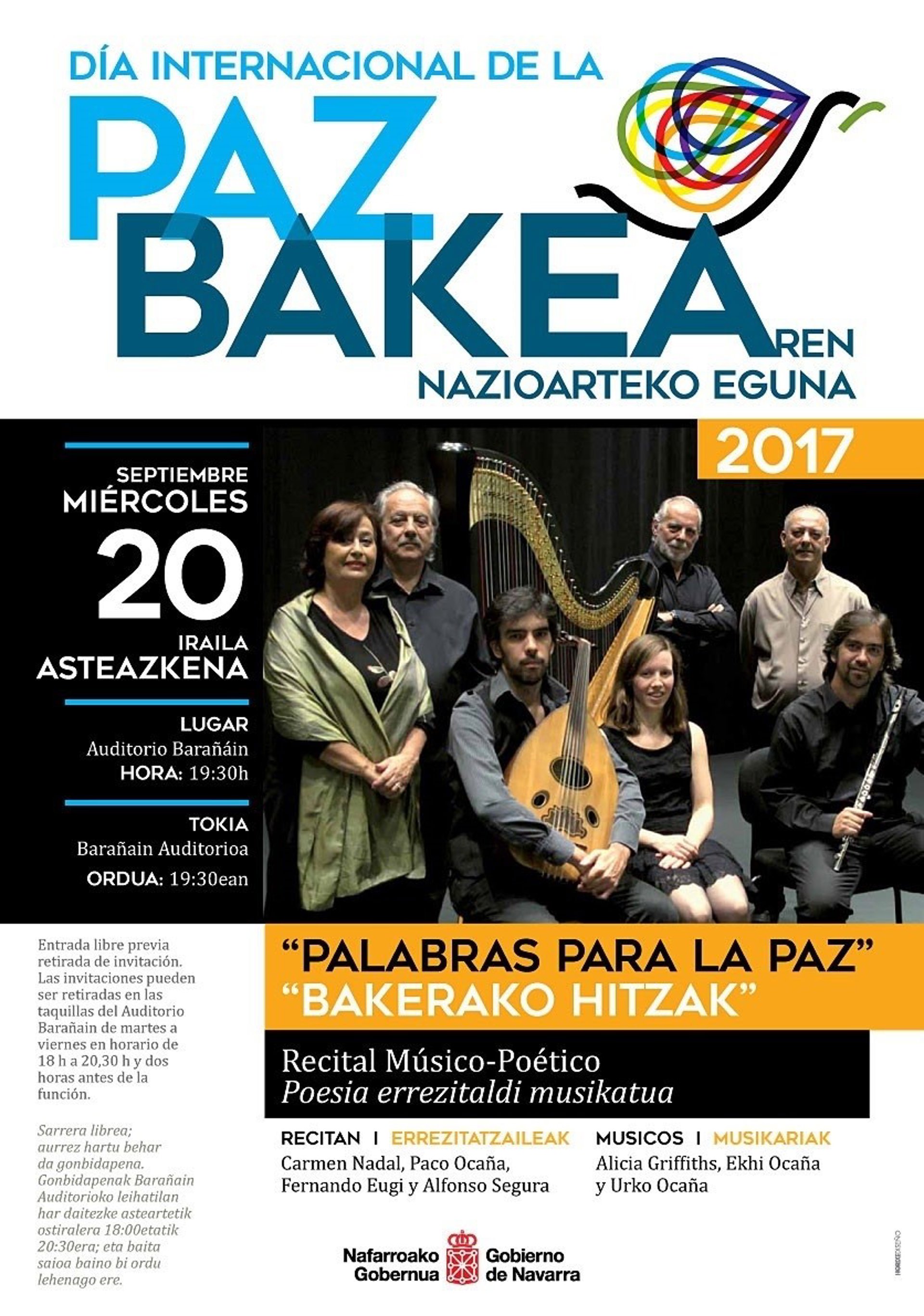 Con motivo de la conmemoración del Día Internacional de la Paz, que se celebra el 21 de septiembre, el Gobierno de Navarra ha organizado este miércoles, a las 19.30 horas, un recital de música y poesía en el Auditorio de Barañain, como preámbulo al acto institucional del día 22 en el que se reconocerá en Tudela la labor de Federico Mayor Zaragoza a favor de una cultura de paz.