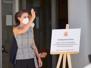 Tras saludar a las autoridades y a los escolares a la puerta del centro, la Reina se ha trasladado al patio del colegio, donde se encontraba otro grupo de alumnos, ordenados en espacios separados por cuerdas, para cumplir con medidas de seguridad frente al Covid-19.