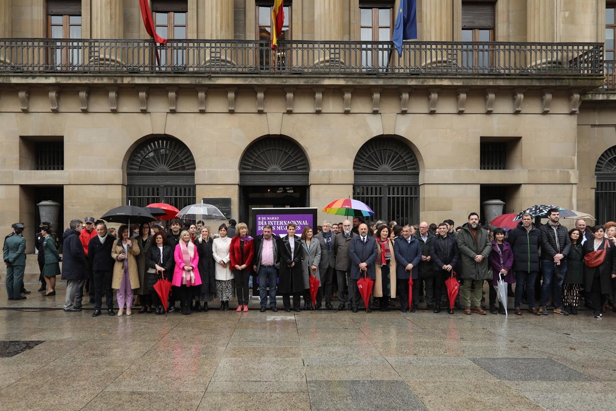 Representantes de distintas instituciones navarras se han concentrado este viernes, convocados por el Gobierno foral, junto al Palacio de Navarra con motivo del Día internacional de las Mujeres, que se conmemora este viernes, 8 de marzo.