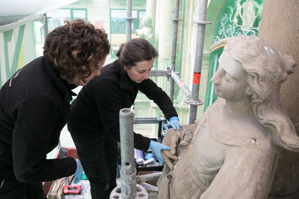 Este martes ha sido restaurada la imagen de 'La Justicia', una de las estatuas que flanquean la puerta principal del Ayuntamiento de Pamplona y que, tras un acto vandálico el pasado mes de abril, quedó sin espada y con la mano derecha rota.