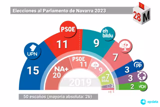 UPN ha ganado las elecciones al Parlamento de Navarra al obtener quince escaños, pero el Partido Socialista, que se mantiene como segunda fuerza con once escaños, los mismos que en 2019, podría optar a revalidar el Gobierno de Navarra con la abstención de EH Bildu.