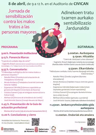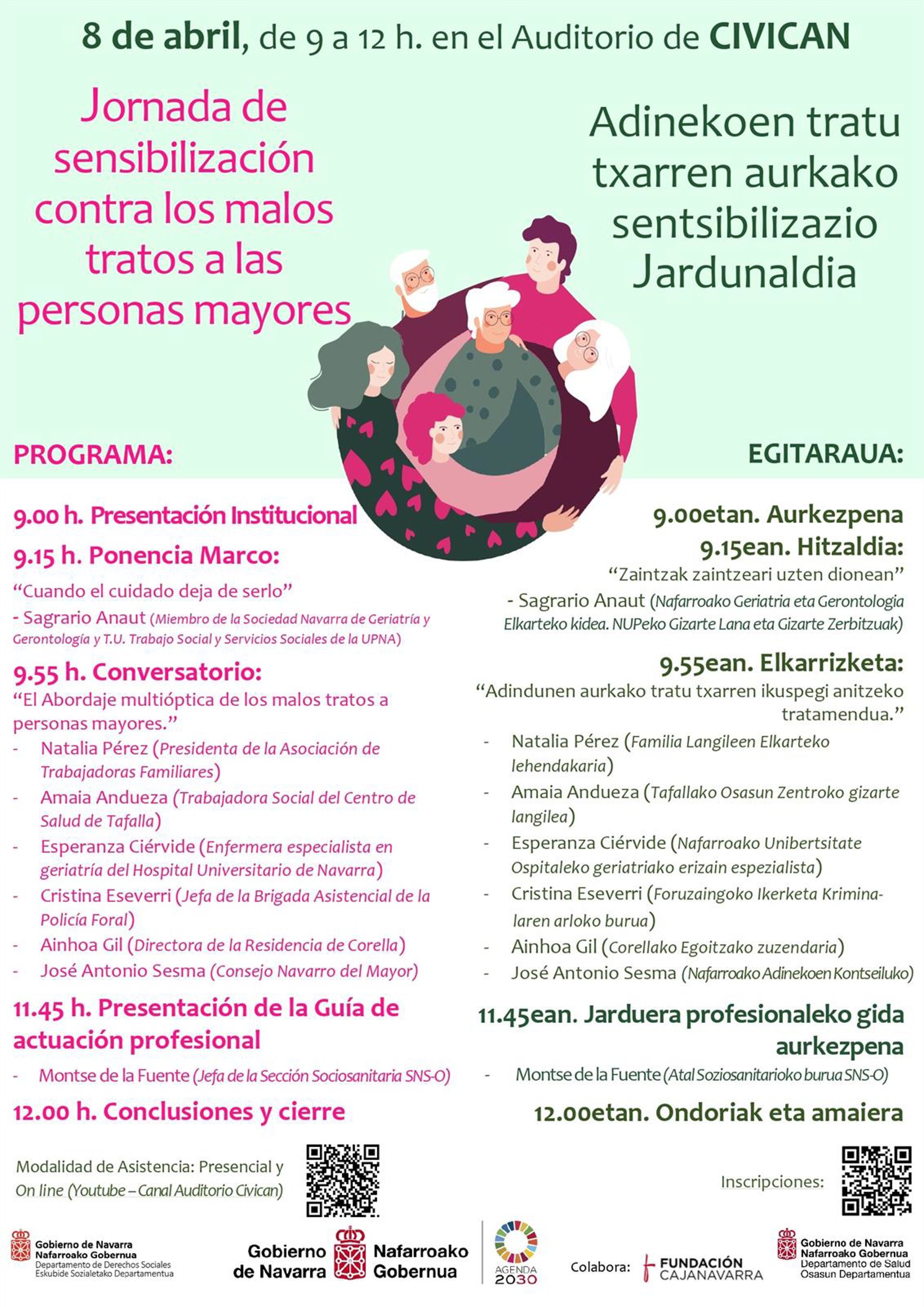 Los departamentos de Salud y Derechos Sociales del Gobierno de Navarra organizan la primera Jornada de Sensibilización Contra los Malos Tratos a las Personas Mayores, que se celebrará el próximo 8 de abril en Civican, Pamplona.