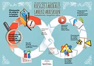 La imagen de la campaña recoge los distintos pasos a dar dentro del ciclo continuo de la gestión de los riesgos laborales: identificación de peligros; eliminación de peligros; evaluación de riesgos; priorización de riesgos; programación preventiva; ejecución de medidas; y estudio de eficacia de las medidas llevadas a cabo.