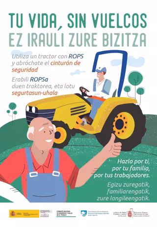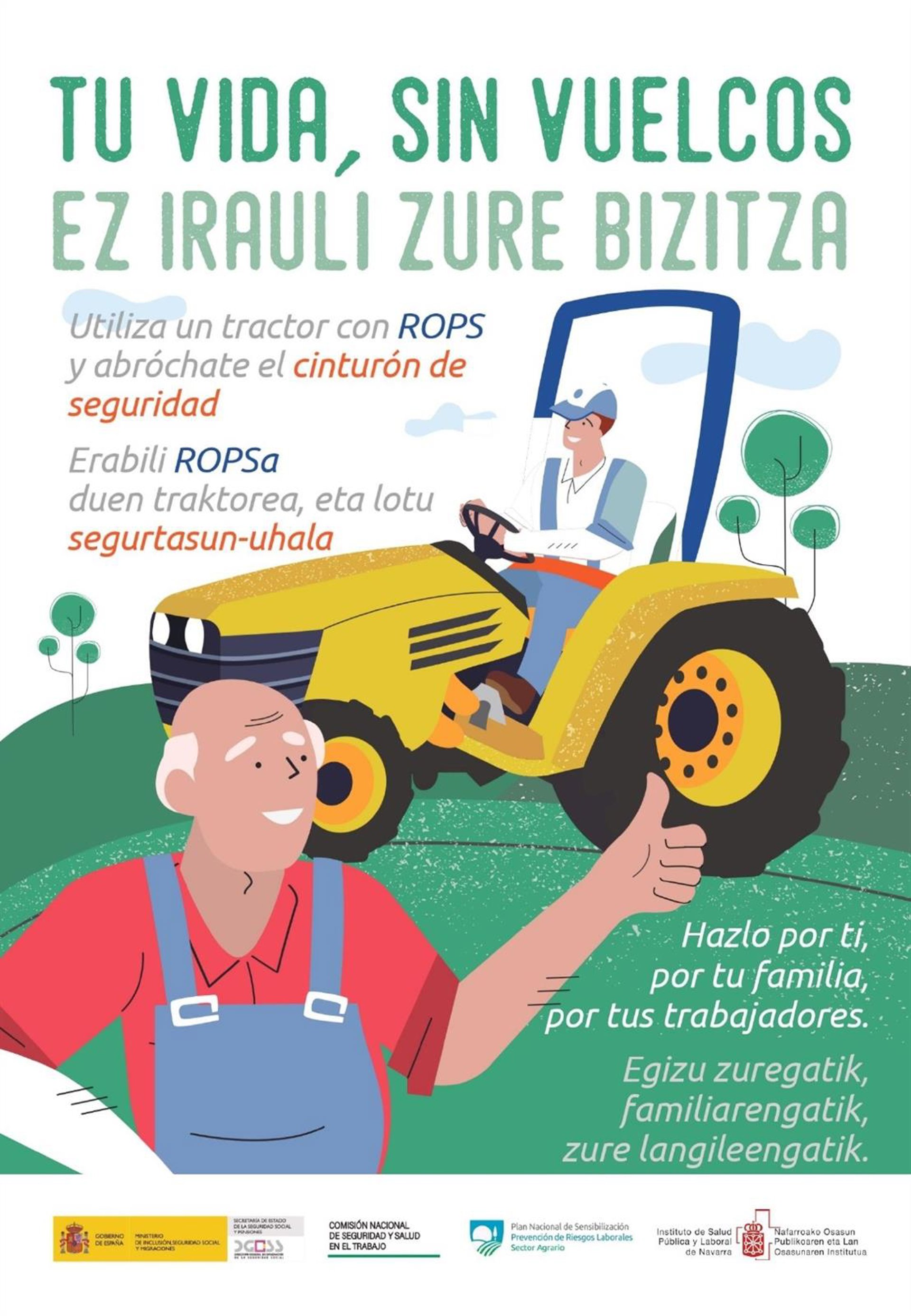 'Tu vida sin vuelcos/ Ez irauli zure bizitza' es la primera medida puesta en marcha en el marco del Plan Nacional de Sensibilización en Prevención de Riesgos Laborales en el Sector Agrario, una iniciativa diseñada por la Comisión Nacional de Seguridad y Salud en el Trabajo (CNSST), de la que forma parte el ISPLN, con la que se pretende mejorar las condiciones de seguridad en los trabajos agrícolas y ganaderos.