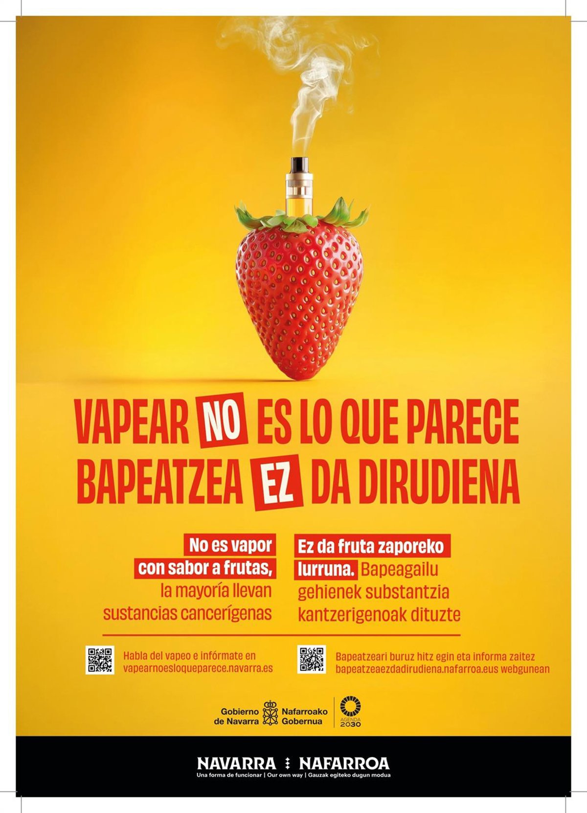 El Instituto de Salud Pública y Laboral de Navarra (ISPLN) ha lanzado una campaña dirigida a sensibilizar sobre los riesgos del vapeo y prevenir su consumo, especialmente entre adolescentes y jóvenes, a través de su entorno familiar y de personas adultas referentes. El objetivo es desmontar mitos como que "solo es vapor con sabor a frutas" o que "no crea adicción".