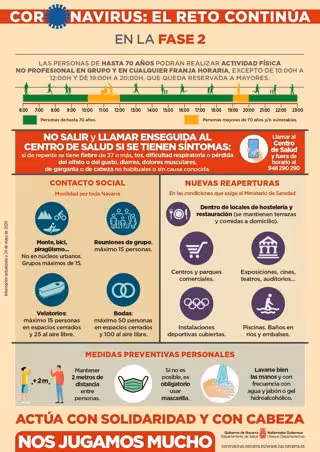 Siguiendo las indicaciones para esta fase 2 establecidas por el Ministerio de Sanidad, ya no están activas las franjas horarias para paseos y actividad física en personas de hasta 70 años (salvo en las horas reservadas para mayores de esa edad y colectivos vulnerables). El ISPLN ha trabajado en coordinación con diferentes actores para preparar y difundir materiales informativos e informes técnicos adecuados.