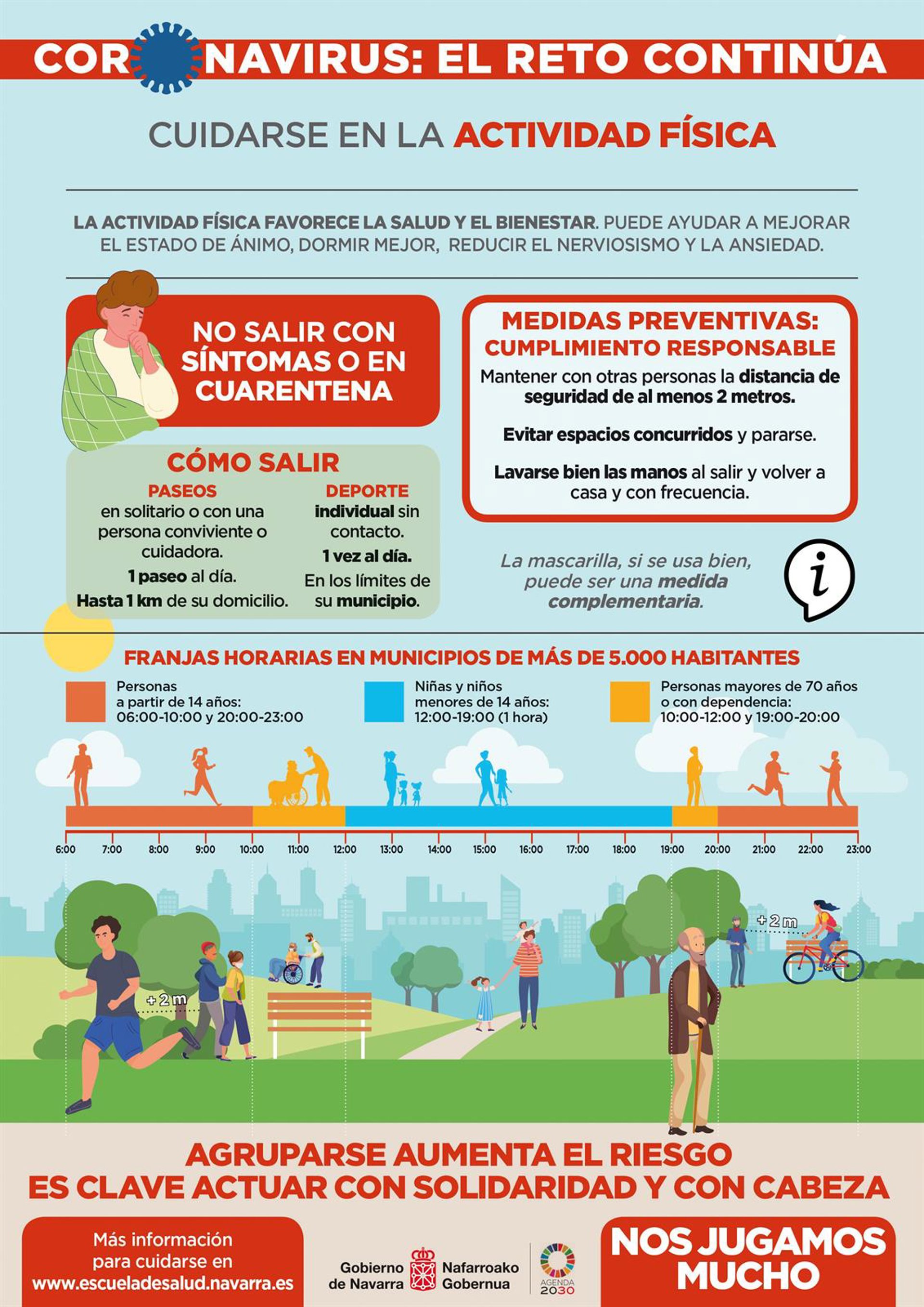 Al mismo tiempo, el departamento hace hincapié en la importancia de mantener un cumplimiento riguroso de las medidas preventivas ante el aumento del riesgo de rebrotes de la epidemia que puede suponer el agruparse en espacios públicos. En este sentido se recuerda que para pasear o hacer deporte se han establecido franjas horarias en las localidades de más de 5.000 habitantes.