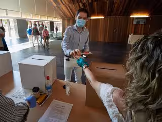 Sergio Sayas, candidato a la presidencia de UPN, realiza su voto durante el congreso de UPN (Unión del Pueblo Navarro) en el que se celebran elecciones para la nueva dirección del partido, en el Palacio del Baluarte, Pamplona, Navarra, Españña, a 28 de - Eduardo Sanz / AFP7 / Europa Press