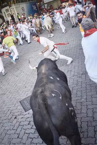 Un toro junto a corredores durante el segundo encierro de las Fiestas de San Fermín 2022 de la ganadería de Fuente Ymbro, en a 8 de julio de 2022, en Pamplona, Navarra (España). - Eduardo Sanz - Europa Press